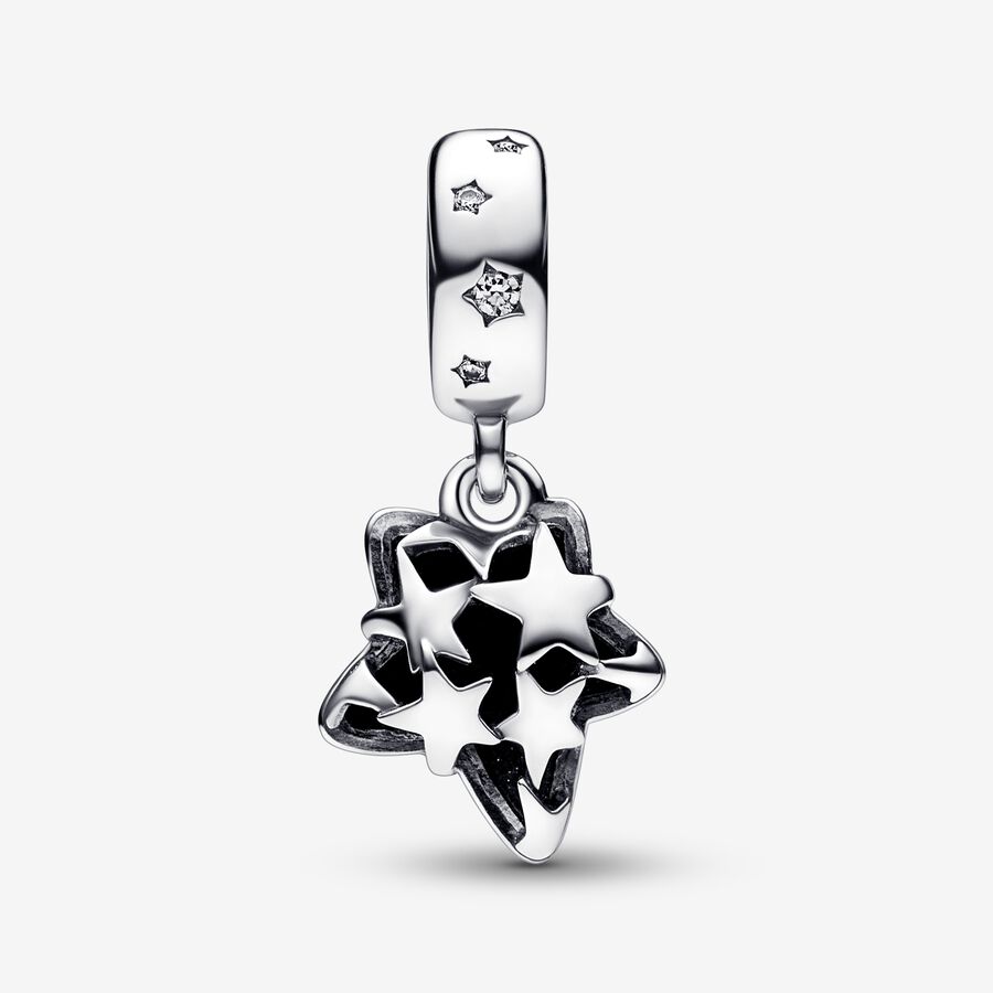Capture the wonder of a clear, starry night with the Celestial Galaxy Star Murano Dangle Charm. This sterling silver dangle charm features a unique asymmetrical star-shaped stone created from Murano glass, with a glittering deep blue starry effect. Sterling silver openwork stars bring an extra layer of detail to the reverse side of the charm, and the bail is decorated with clear cubic zirconia stones set within imprinted star shapes. Style it on your bracelet of charm holder to add a touch of stardust to your look.