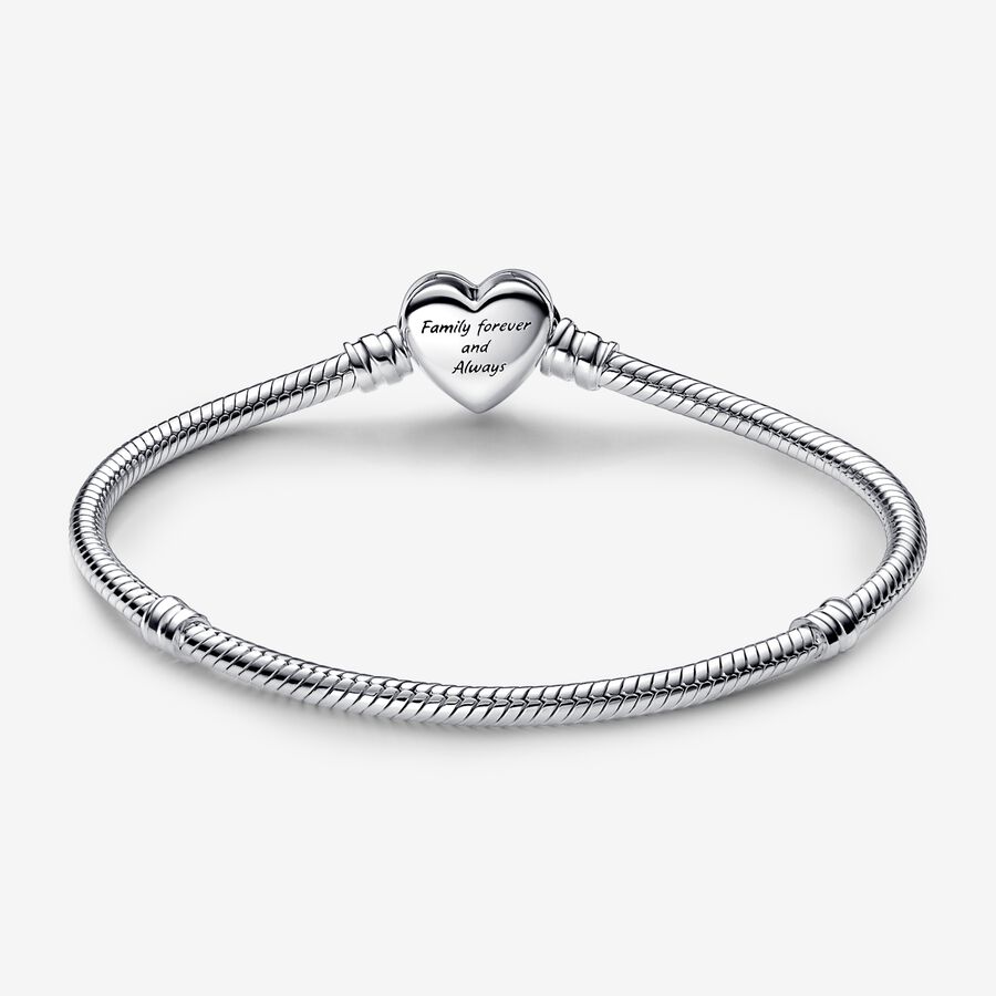 Representing the eternal love that binds family together, the Pandora Moments Sparkling Infinity Heart Clasp Snake Chain Bracelet is a meaningful gift for the ones that matter most to you. The openwork heart clasp features stones along the edge and an asymmetrical infinity symbol entwining around the heart. The back of the clasp is engraved with the message “Family forever and Always”. The bracelet features two threaders (raised charm dividers) dividing it into three sections. Style it with up to 16-18 of your favorite charms or dangle charms to symbolize the ones you love, or gift it to someone close to your heart.