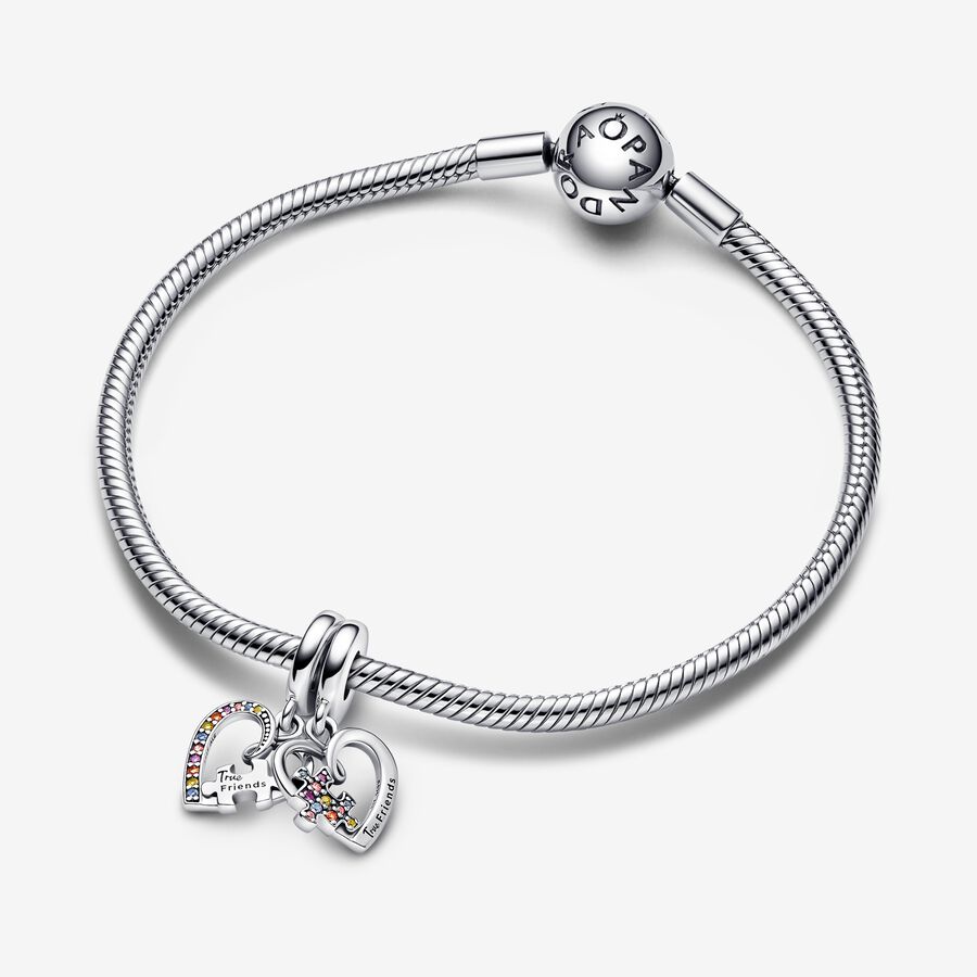 Crafted in sterling silver, the Puzzle Piece Hearts Splittable Friendship Dangle Charm serves as a reminder that friends complete us. Designed for sharing, it features two dangles that combine a cutout heart with a puzzle piece – both are decorated on one side by an array of colorful stones. The bail is engraved with a message: “My Missing Piece.” Give one to your bestie and join the pieces whenever you’re together to connect in a whole new way.
